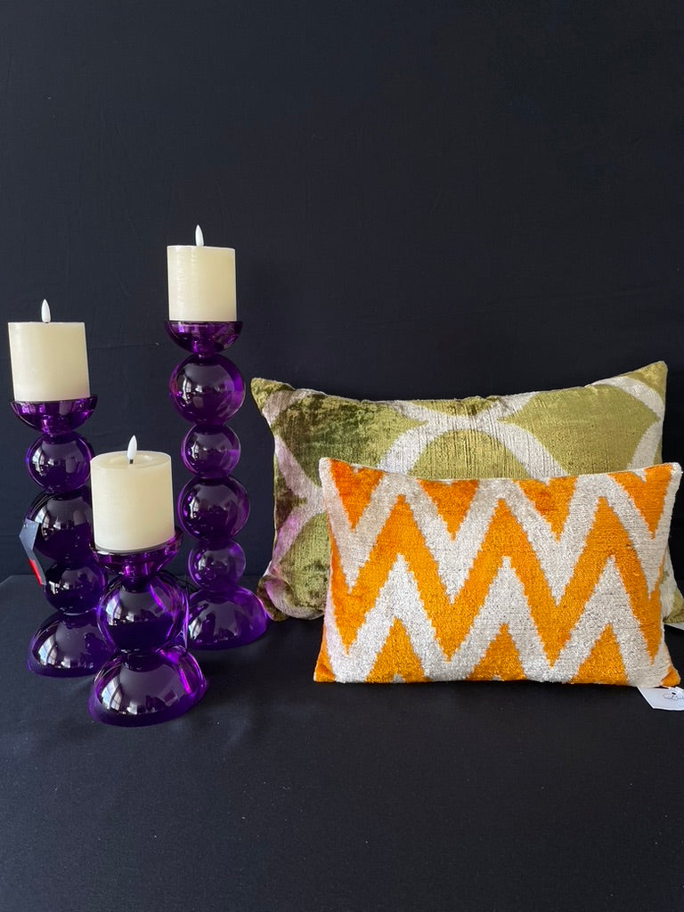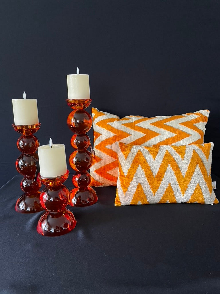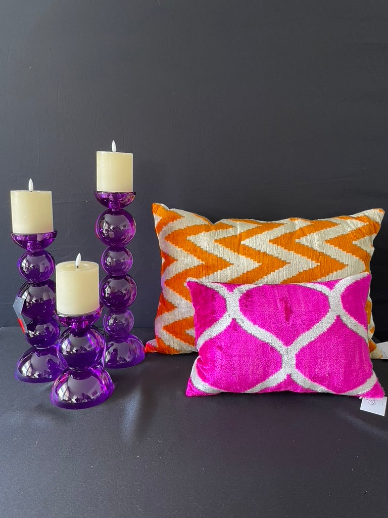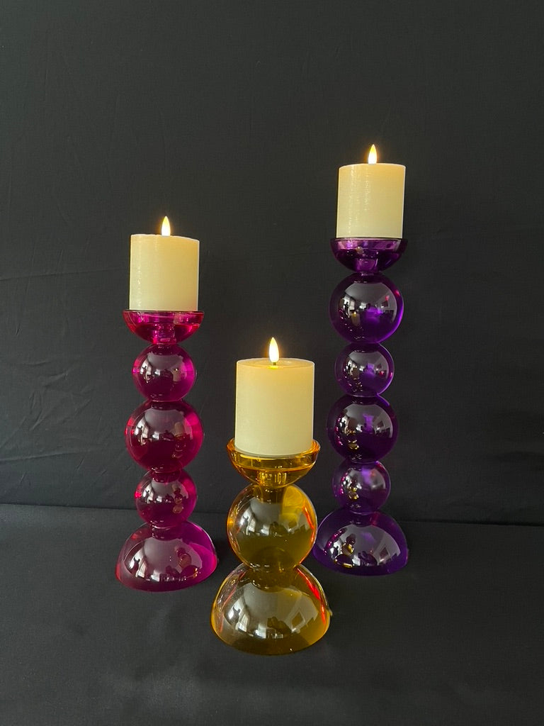 Breng kleur en karakter in je interieur met deze opvallende glazen kandelaren. Elk exemplaar is gemaakt van dik, transparant glas in levendige kleuren zoals fuchsia, oranje, geel en paars. De speelse bolvormige structuur geeft ze een modern karakter, perfect om een statement te maken op een tafel, dressoir of vensterbank.
