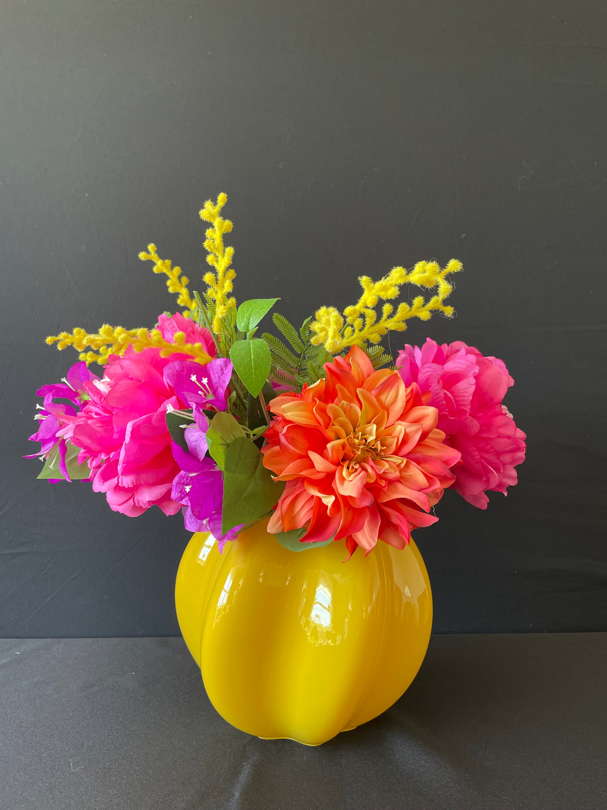 Vrolijke gele vaas met zijden boeket van Colmore by Diga